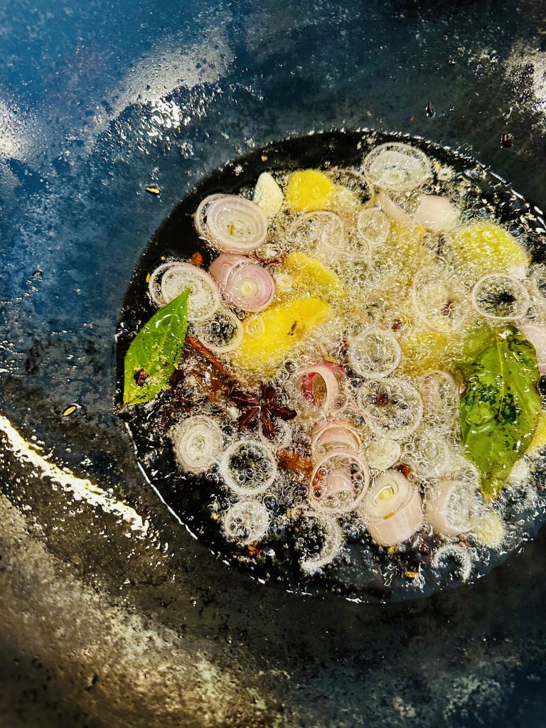 Let everything gently sizzle over medium-low heat for 15–20 minutes. The goal is slow infusion, not frying. Shallots should be lightly golden and the oil deeply aromatic. Honestly, this is why we keep making this at home: yes, it’s chili crisp, but it’s also the most flavourful oil we’ve ever made.
